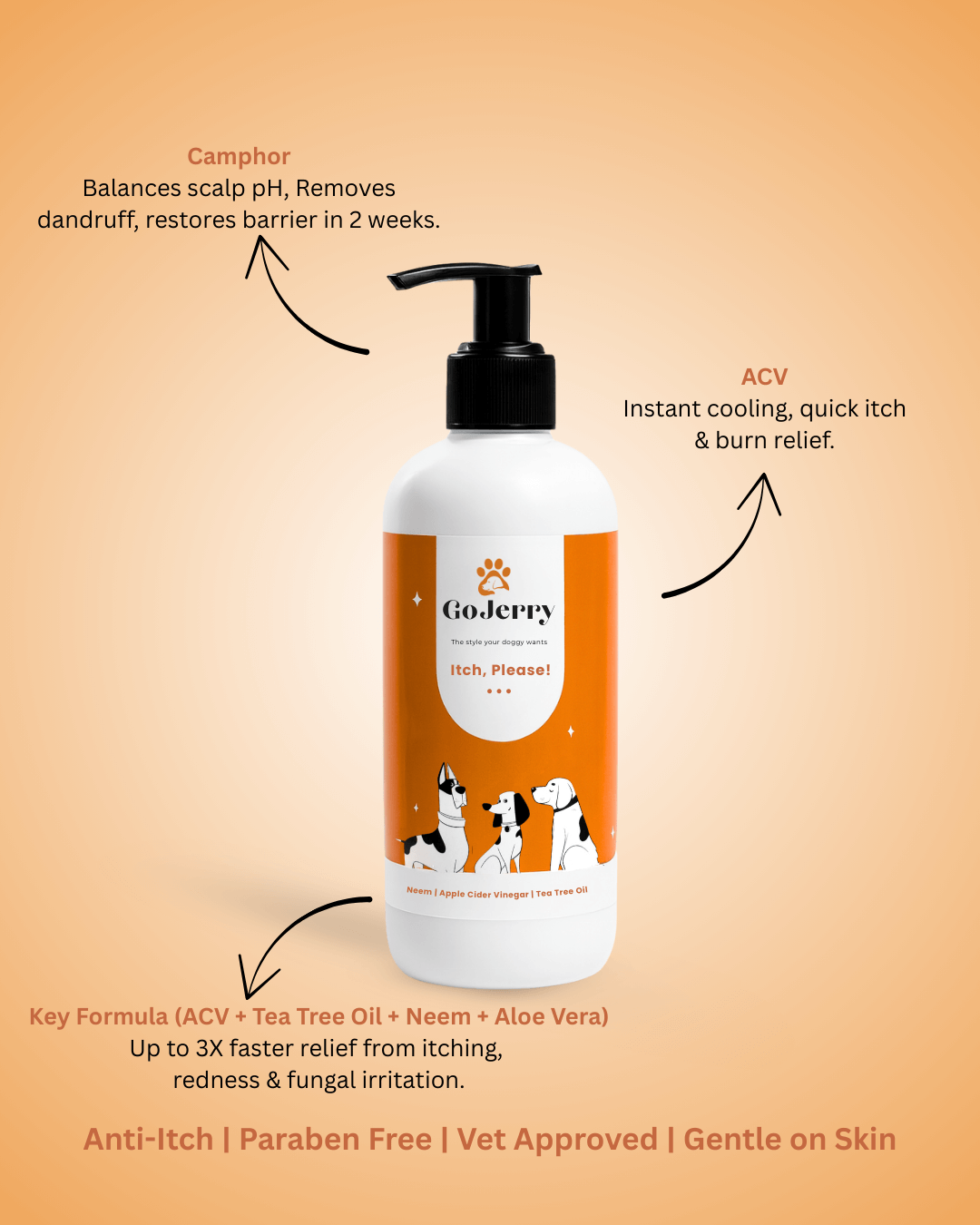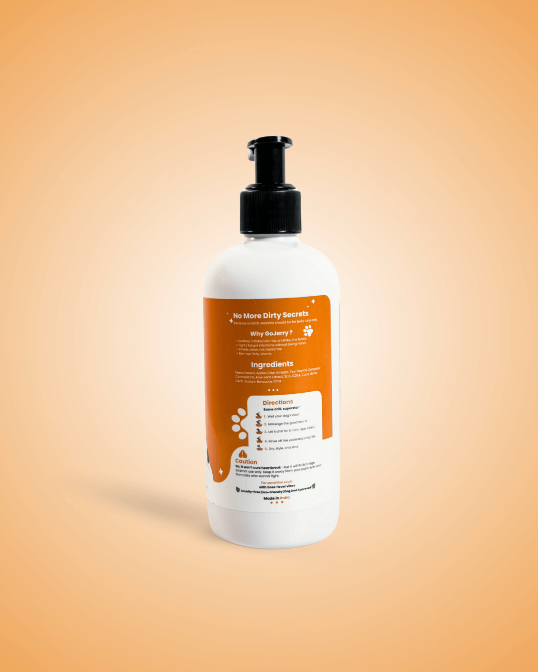 GoJerry brings you a premium, natural solution for your dog’s skin and coat health. Our Anti-Itch Dog Shampoo is carefully crafted with a potent neem-based formula that is gentle, irritation-free, and completely tearless – making bath time stress-free for both you and your pet. Enhanced with the power of Neem, ACV, Tea Tree Oil, Camphor and Citronella Oil, this shampoo not only cleanses and hydrates dry, itchy skin but also provides natural protection against ticks, fleas, insects, and parasites. These ingredients are widely recommended by veterinarians for their effectiveness in promoting coat health and long-lasting protection. With GoJerry, you get more than just a shampoo – you get a trusted, vet-approved formula that supports your dog’s comfort, coat shine, and overall well-being. Because your furry friend deserves nothing but the best care, naturally. By GoJerry – The Style Your Doggy Wants.